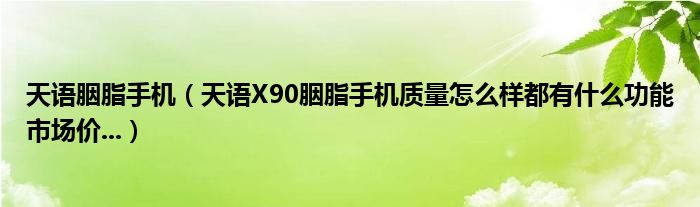 1,天语X90胭脂手机质量怎么样?都有什么功能?市场价...:天语X90质量过关的,是天宇集团花重资为女性打造的。购买的人很多,外观时尚,主要还是看自己喜欢,如果说要和诺基亚大品牌比肯定没法比。杭州国美话机价格是1500元,不知道你是哪里的?以下是优点和缺点天语胭脂手机优点:1、180度旋屏机身设计,小巧时尚胭脂盒造型2、MTUNES音乐播放器、杜比环绕立体声3、女性安全功能,花朵主题界面4、UCWEB网络浏览器5、2.4寸QVGA大视野宽屏6、特有安全中心,一键防狼双料保险,若手机丢失,一个短信,既能得知谁在使用不足:1、机身有点胖2、电池容量一般,不是非常经用。天语胭脂手机紫色价格:http://www.ceetop.com/Product_122303.html