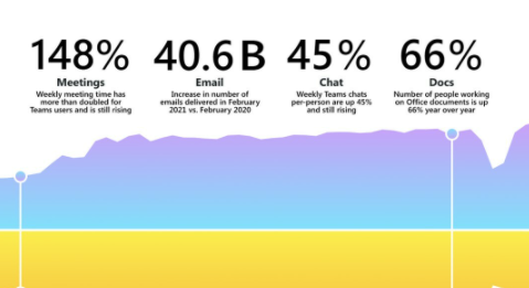 微软表示,在那段时间里,使用其Teams应用程序的会议在全球范围内增加了一倍多,而且这个数字还在攀升。该研究还表明,现在视频会议的平均时间延长了10分钟。大多数员工每周还要处理45%的商务消息聊天,其中42%是在下班后。再一次,这些数字仍在上升。最后,从2020年到2021年,微软在其商业和教育客户中处理的电子邮件数量增加了406亿封。