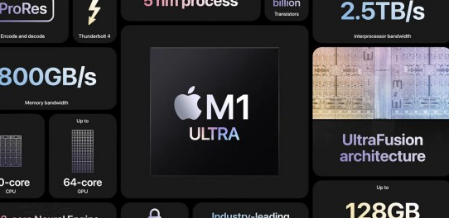 新的M1超有这就是所谓的超融合的芯片到芯片连接能力。在M1超是M1最大的两倍大小,因此,为什么它能够简单地进行这种可笑的强大的任务。该芯片是建立在5nm的过程和支持Thunderbolt4,并且它具有2.5TB/s的处理器间的带宽。新架构降低了延迟,而且它有114个十亿个晶体管。内存带宽已增加至800GB/秒。
