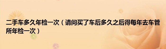 6,二手车多久年检一次:6年内,每2年检测一次,超过6年每年检一次,超过15年的,每6个月检验1次。车辆年检,就是指每个已经取得正式号牌和行驶证的车辆都必须要的一项检测,相当于每年一次按《机动车运行安全技术条件》给车辆做体检。车辆年检可以及时消除车辆安全隐患,督促加强汽车的维护保养,减少交通事故的发生。对于车辆年检在《道路交通安全法实施条例》等文件中有相关规定,在年检前需要一些准备工作(例如知道一些相关信息,网上预约,流程,车需要注意的问题等)以保证能够正常顺利通过,年检有初次和定期年检,也有一些相关政策。机动车多久检一次?国家规定,机动车必须定期通过尾气检测、汽车外观、车灯、刹车、底盘等检测合格,并以无违章记录的情况下,发放检验合格标志。所有年检日期按行驶证上登记的日期为准,机动车从注册登记之日起,按照下列期限进行安全技术检验,一般统称为“年检”或“年审”。小型、微型非营运载客汽车6年内,每2年检测一次,超过6年每年检一次,超过15年的,每6个月检验1次。营运载客汽车5年以内每年检验1次;超过5年的,每6个月检验1次。载货汽车和大型、中型非营运载客汽车10年以内每年检验1次;超过10年的,每6个月检验1次。进口车辆跟其它车型一样,在任意检测场都可以定期检验。以上内容来自 百度百科-车辆年检
