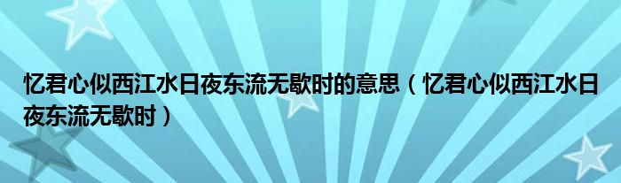 关于忆君心似西江水日夜东流无歇时的意思,忆君心似西江水日夜东流无歇时这个很多人还不知道,今天菲菲来为大家解答以上的问题,现在让我们一起来看看吧!