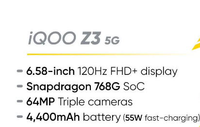 iQOO Z3 5G 配备 6.58 英寸 FHD+ LCD 显示屏,频率为 120Hz。它还符合 HDR10+ 标准,涵盖 96% 的 NTSC 色域。它有望成为有史以来第一款使用高通骁龙 768G SoC 的智能手机。它的 4,400mAh 电池支持 55W 快速充电。